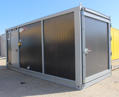Для удобства загрузки и обслуживания оборудования оборудованы распашные торцевые ворота с промышленной фурнитурой и надежными уплотнителями, а также предусмотрены проходки в стенах под подачу и слив воды. Безопасность объекта повышена за счет модулей порошкового пожаротушения, установленных внутри.